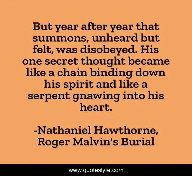 This page presents the quote "But year after year that summons, unheard but felt, was disobeyed. His one secret thought became like a chain binding down his spirit and like a serpent gnawing into his heart.". Author of this quote is Nathaniel Hawthorne, Roger Malvin's Burial. .