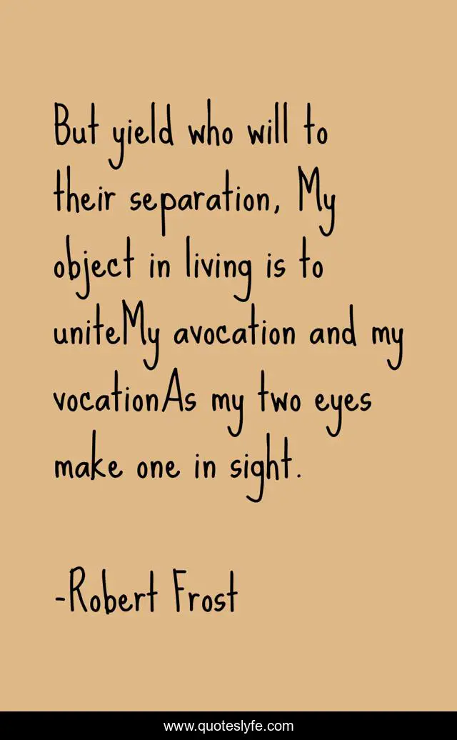 This page presents the quote "But yield who will to their separation, My object in living is to uniteMy avocation and my vocationAs my two eyes make one in sight.". Author of this quote is Robert Frost. This quote is about goals, inspiration,.