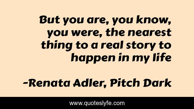 This page presents the quote "But you are, you know, you were, the nearest thing to a real story to happen in my life". Author of this quote is Renata Adler, Pitch Dark. This quote is about heartbreak, love, lost-love, affection,.