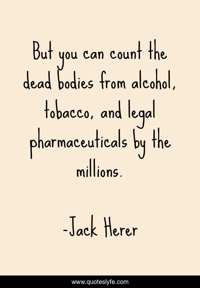 This page presents the quote "But you can count the dead bodies from alcohol, tobacco, and legal pharmaceuticals by the millions.". Author of this quote is Jack Herer. This quote is about count, alcohol,.