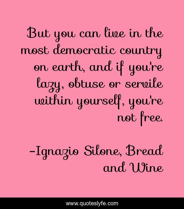 This page presents the quote "But you can live in the most democratic country on earth, and if you're lazy, obtuse or servile within yourself, you're not free.". Author of this quote is Ignazio Silone, Bread and Wine. This quote is about freedom, self, growth, democracy,.
