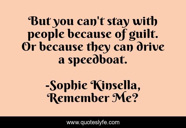 This page presents the quote "But you can't stay with people because of guilt. Or because they can drive a speedboat.". Author of this quote is Sophie Kinsella, Remember Me?. This quote is about friendship, love, humor, affection,.