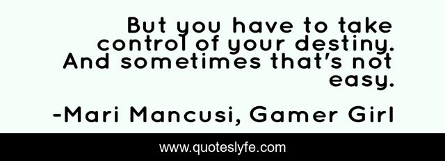 This page presents the quote "But you have to take control of your destiny. And sometimes that's not easy.". Author of this quote is Mari Mancusi, Gamer Girl. This quote is about mom, mother-daughter-talk, gamer-girl, maddy, life-lessons, mari-mancusi, destiny,.