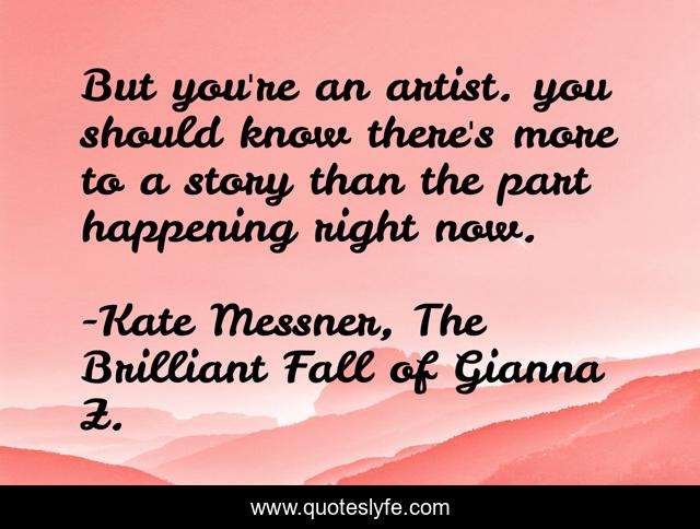 This page presents the quote "But you're an artist. you should know there's more to a story than the part happening right now.". Author of this quote is Kate Messner, The Brilliant Fall of Gianna Z.. This quote is about art, stories, artist,.