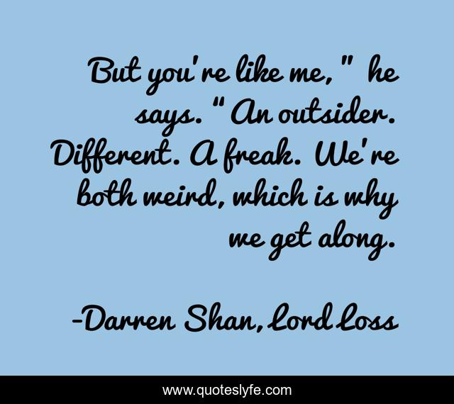 This page presents the quote "But you're like me, ” he says. “An outsider. Different. A freak. We're both weird, which is why we get along.". Author of this quote is Darren Shan, Lord Loss. This quote is about bill-e, friendship, grubbs-grady,.