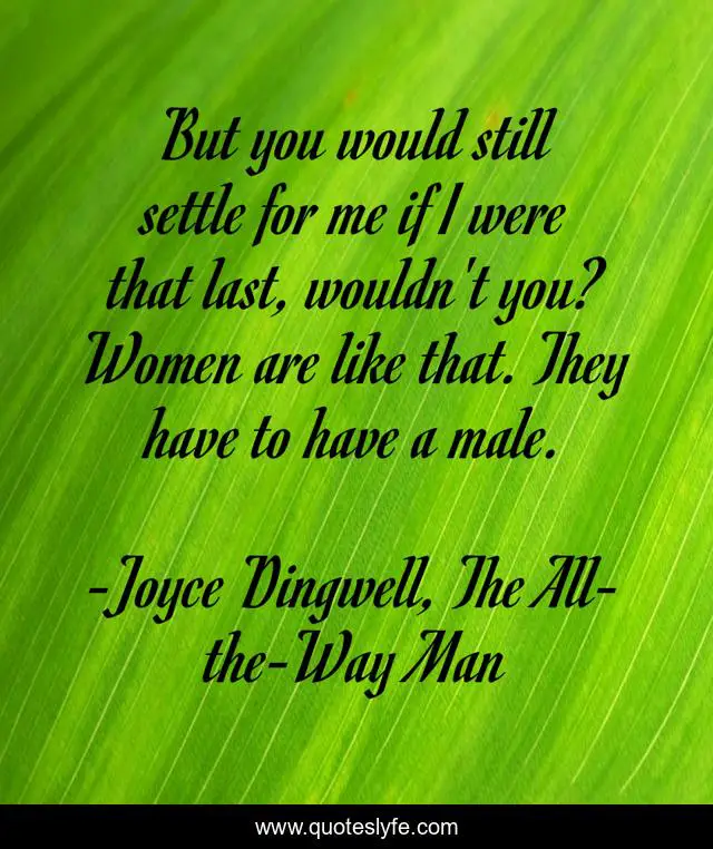 This page presents the quote "But you would still settle for me if I were that last, wouldn't you? Women are like that. They have to have a male.". Author of this quote is Joyce Dingwell, The All-the-Way Man. This quote is about settle, men, women,.