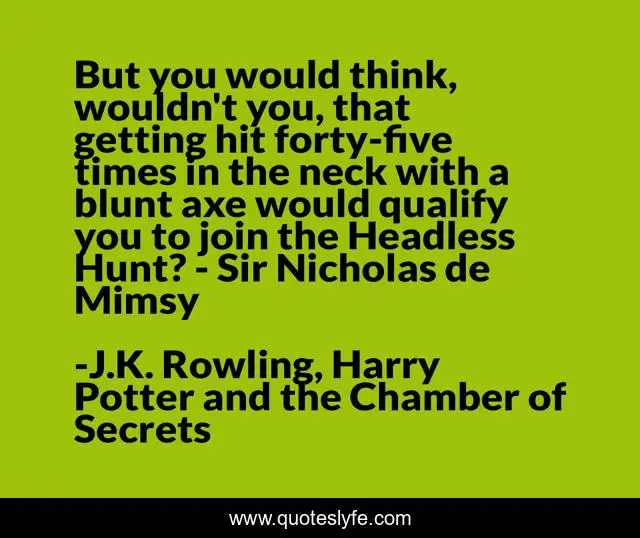 This page presents the quote "But you would think, wouldn't you, that getting hit forty-five times in the neck with a blunt axe would qualify you to join the Headless Hunt? - Sir Nicholas de Mimsy". Author of this quote is J.K. Rowling, Harry Potter and the Chamber of Secrets. This quote is about funny, comedy, harry-potter, nearly-headless-nick,.