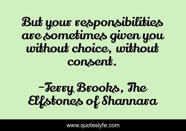 This page presents the quote "But your responsibilities are sometimes given you without choice, without consent.". Author of this quote is Terry Brooks, The Elfstones of Shannara. .