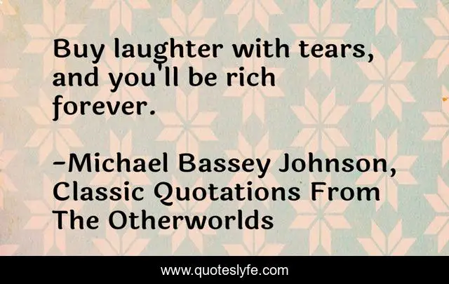 This page presents the quote "Buy laughter with tears, and you'll be rich forever.". Author of this quote is Michael Bassey Johnson, Classic Quotations From The Otherworlds. This quote is about negotiation, forever, wealth, exchange, agony, trade, tears, swap, laughter,.