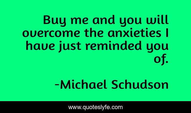 This page presents the quote "Buy me and you will overcome the anxieties I have just reminded you of.". Author of this quote is Michael Schudson. .