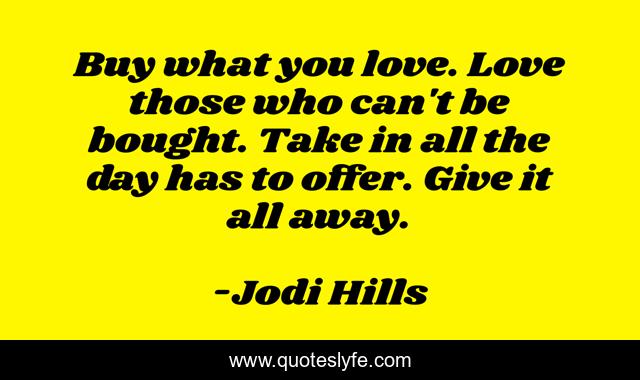 This page presents the quote "Buy what you love. Love those who can't be bought. Take in all the day has to offer. Give it all away.". Author of this quote is Jodi Hills. This quote is about love, gift, give, absorb, share, take-in, live, affection,.