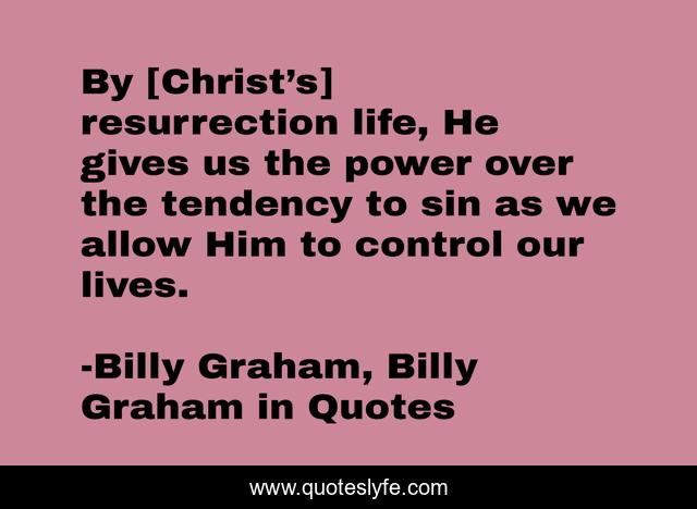 This page presents the quote "By [Christ’s] resurrection life, He gives us the power over the tendency to sin as we allow Him to control our lives.". Author of this quote is Billy Graham, Billy Graham in Quotes. This quote is about resurrection, billy-graham,.