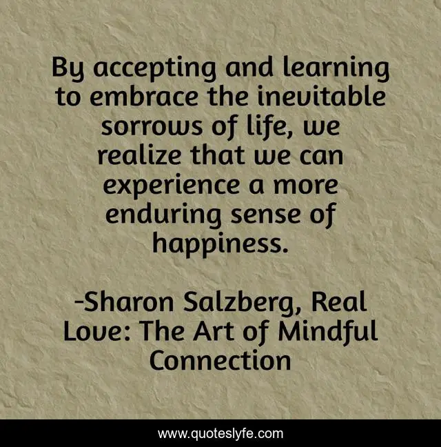 This page presents the quote "By accepting and learning to embrace the inevitable sorrows of life, we realize that we can experience a more enduring sense of happiness.". Author of this quote is Sharon Salzberg, Real Love: The Art of Mindful Connection. This quote is about love, mindfulness, sorrow, acceptance, meditation, real-love, affection,.