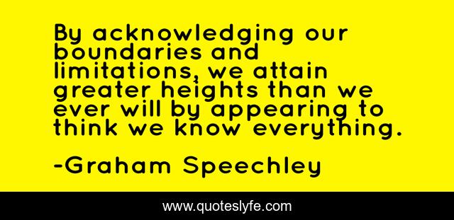 This page presents the quote "By acknowledging our boundaries and limitations, we attain greater heights than we ever will by appearing to think we know everything.". Author of this quote is Graham Speechley. This quote is about famous-leadership, knowing-everything, accepting-limitations, quotes-on-leadership, quotes-about-leadership, arrogance, great-leadership, humility, pride,.