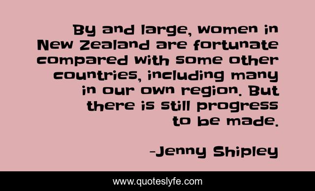 This page presents the quote "By and large, women in New Zealand are fortunate compared with some other countries, including many in our own region. But there is still progress to be made.". Author of this quote is Jenny Shipley. This quote is about progress, new, fortunate,.