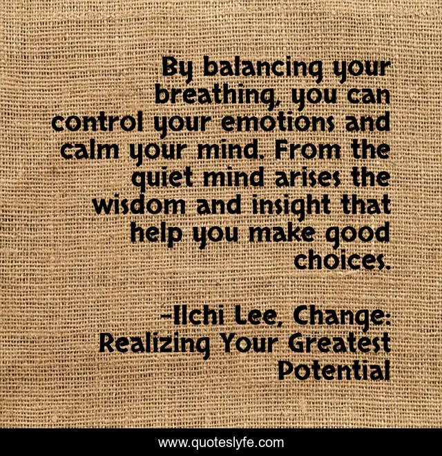 This page presents the quote "By balancing your breathing, you can control your emotions and calm your mind. From the quiet mind arises the wisdom and insight that help you make good choices.". Author of this quote is Ilchi Lee, Change: Realizing Your Greatest Potential. This quote is about inspirational-life, self-development,.