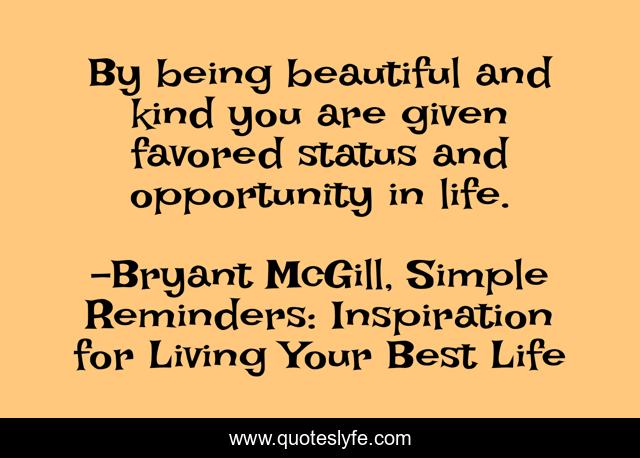 This page presents the quote "By being beautiful and kind you are given favored status and opportunity in life.". Author of this quote is Bryant McGill, Simple Reminders: Inspiration for Living Your Best Life. This quote is about giving, life, kindness, beauty, opportunities,.