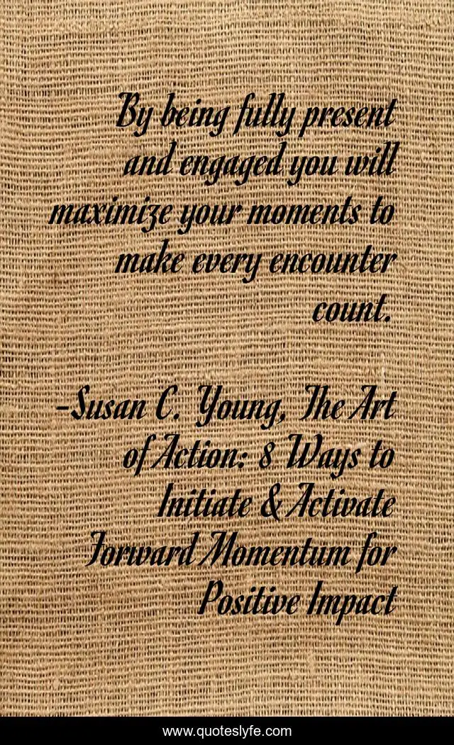 "Susan C. Young, The Art of Action: 8 Ways to Initiate & Activate Forward Momentum for Positive Impact Quotes." Quoteslyfe.com, 2025. Sat. 06 Dec. 2025. <https://www.quoteslyfe.com/quote/By-being-fully-present-and-engaged-you-233492>.