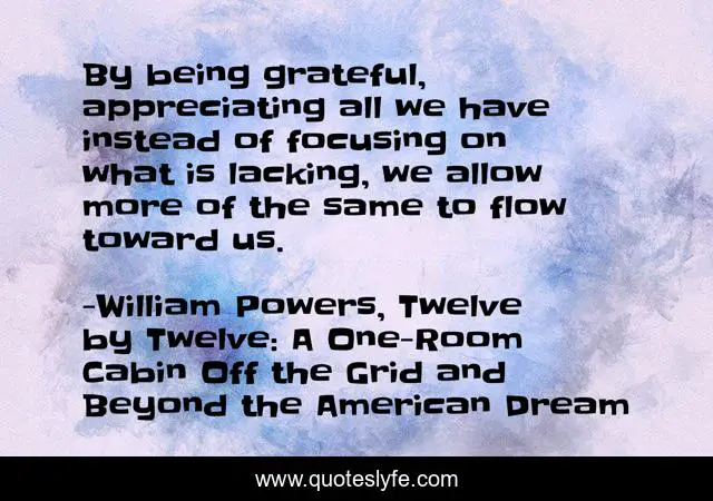 This page presents the quote "By being grateful, appreciating all we have instead of focusing on what is lacking, we allow more of the same to flow toward us.". Author of this quote is William Powers, Twelve by Twelve: A One-Room Cabin Off the Grid and Beyond the American Dream. This quote is about appreciation, gratefulness,.