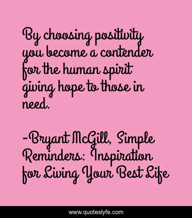 This page presents the quote "By choosing positivity you become a contender for the human spirit giving hope to those in need.". Author of this quote is Bryant McGill, Simple Reminders: Inspiration for Living Your Best Life. This quote is about giving, becoming, choices, spirituality, positivity, hope,.