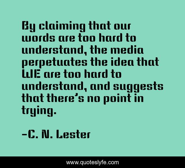 This page presents the quote "By claiming that our words are too hard to understand, the media perpetuates the idea that WE are too hard to understand, and suggests that there’s no point in trying.". Author of this quote is C. N. Lester. This quote is about linguistics, language, gender, lgbtq, words, pronouns, transgender, genderqueer,.