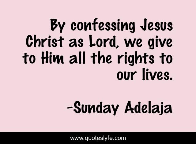 This page presents the quote "By confessing Jesus Christ as Lord, we give to Him all the rights to our lives.". Author of this quote is Sunday Adelaja. This quote is about confessing, lives, rights,.