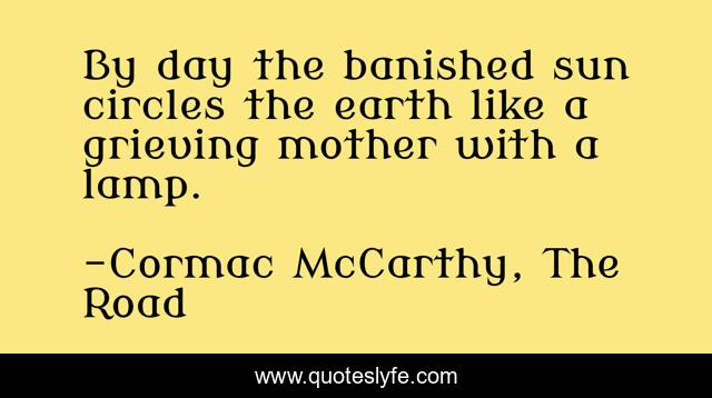 This page presents the quote "By day the banished sun circles the earth like a grieving mother with a lamp.". Author of this quote is Cormac McCarthy, The Road. This quote is about earth, mother, sun,.