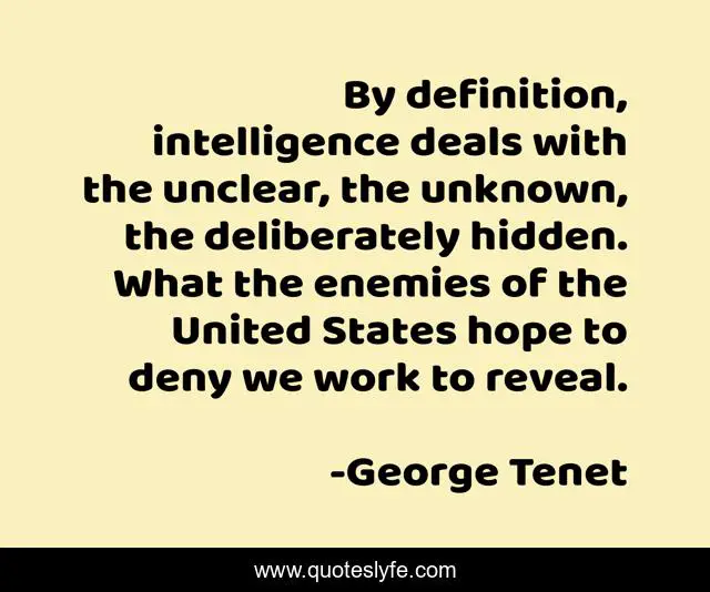 "George Tenet Quotes." Quoteslyfe.com, 2025. Fri. 05 Dec. 2025. <https://www.quoteslyfe.com/quote/By-definition-intelligence-deals-with-the-unclear-283259>.