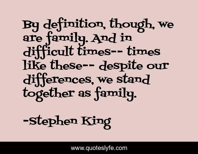 This page presents the quote "By definition, though, we are family. And in difficult times-- times like these-- despite our differences, we stand together as family.". Author of this quote is Stephen King. This quote is about if-thy-right-hand-offend-thee, family, american-vampire,.