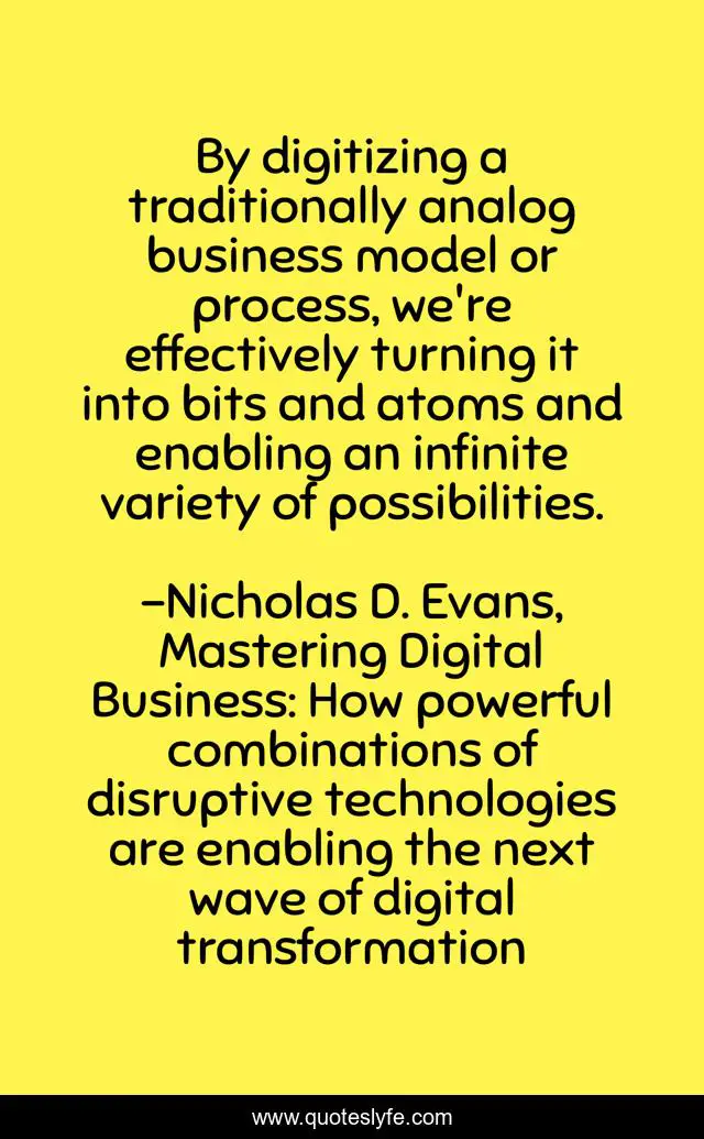 This page presents the quote "By digitizing a traditionally analog business model or process, we're effectively turning it into bits and atoms and enabling an infinite variety of possibilities.". Author of this quote is Nicholas D. Evans, Mastering Digital Business: How powerful combinations of disruptive technologies are enabling the next wave of digital transformation. This quote is about business-model, digital-transformation, digitization, business,.