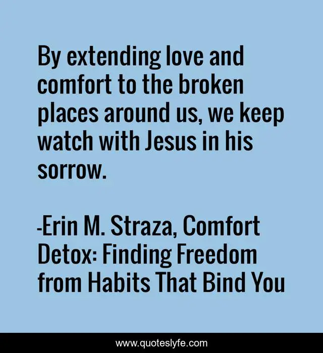 This page presents the quote "By extending love and comfort to the broken places around us, we keep watch with Jesus in his sorrow.". Author of this quote is Erin M. Straza, Comfort Detox: Finding Freedom from Habits That Bind You. This quote is about faith, spiritual-formation, sorrow, comfort, inspirational, helping-others, enthusiasm,.