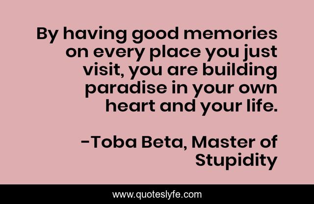 This page presents the quote "By having good memories on every place you just visit, you are building paradise in your own heart and your life.". Author of this quote is Toba Beta, Master of Stupidity. This quote is about memory, heart, life, good, paradise,.