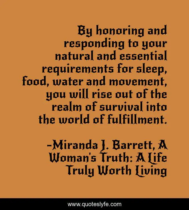 This page presents the quote "By honoring and responding to your natural and essential requirements for sleep, food, water and movement, you will rise out of the realm of survival into the world of fulfillment.". Author of this quote is Miranda J. Barrett, A Woman's Truth: A Life Truly Worth Living. This quote is about survival, sleep, fulfillment, self-care,.