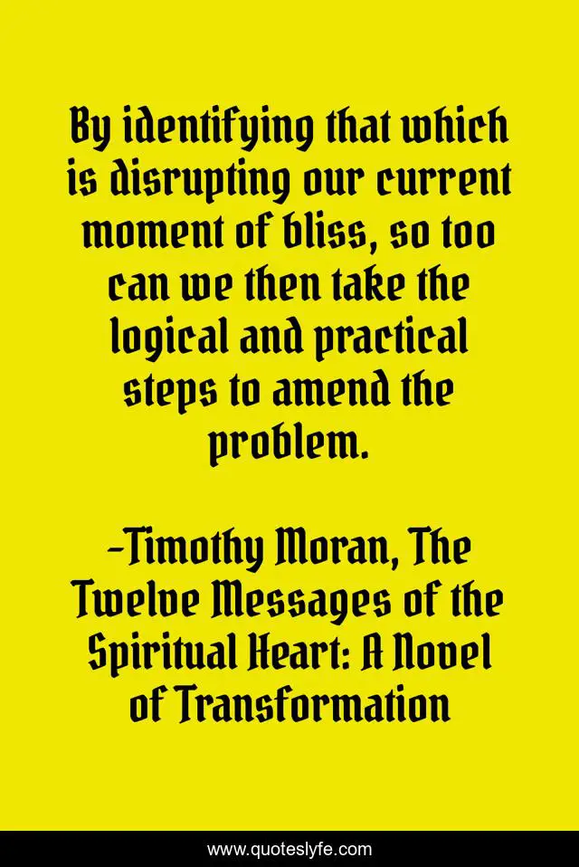 This page presents the quote "By identifying that which is disrupting our current moment of bliss, so too can we then take the logical and practical steps to amend the problem.". Author of this quote is Timothy Moran, The Twelve Messages of the Spiritual Heart: A Novel of Transformation. .