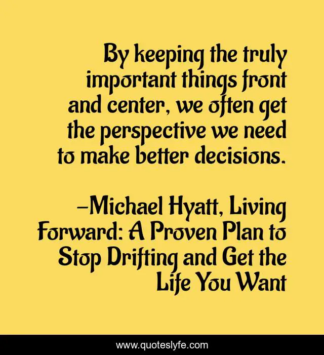 This page presents the quote "By keeping the truly important things front and center, we often get the perspective we need to make better decisions.". Author of this quote is Michael Hyatt, Living Forward: A Proven Plan to Stop Drifting and Get the Life You Want. This quote is about personal-development, decisions, intentional-living, priorities, life-plan,.