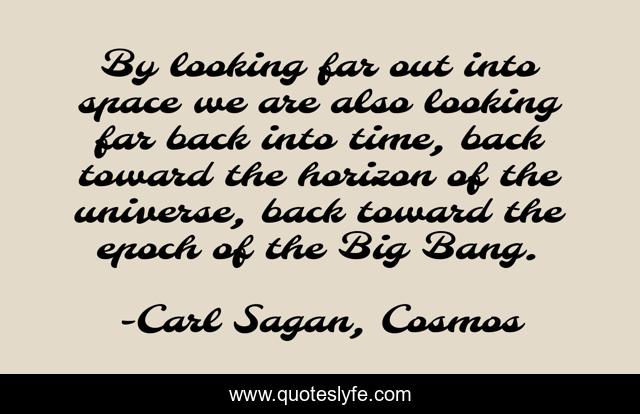 This page presents the quote "By looking far out into space we are also looking far back into time, back toward the horizon of the universe, back toward the epoch of the Big Bang.". Author of this quote is Carl Sagan, Cosmos. This quote is about science, astronomy, space, big-bang, time,.