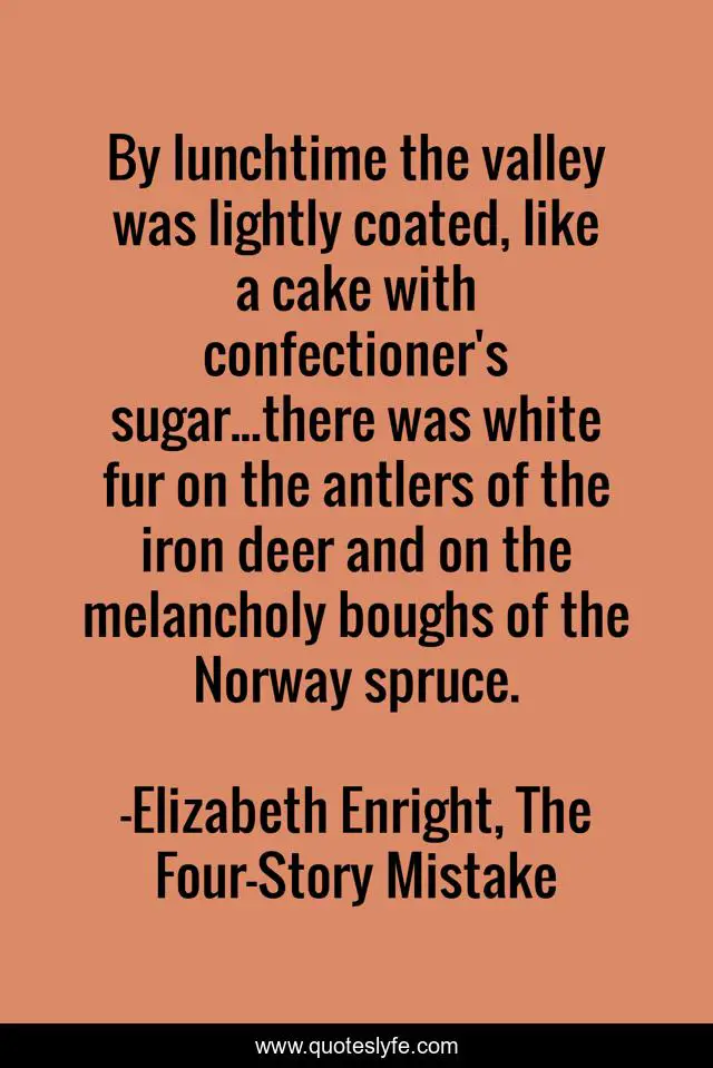This page presents the quote "By lunchtime the valley was lightly coated, like a cake with confectioner's sugar...there was white fur on the antlers of the iron deer and on the melancholy boughs of the Norway spruce.". Author of this quote is Elizabeth Enright, The Four-Story Mistake. .