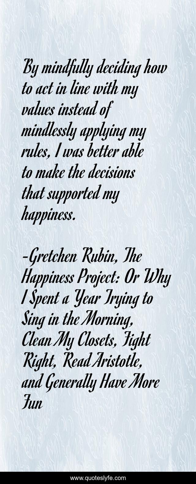 This page presents the quote "By mindfully deciding how to act in line with my values instead of mindlessly applying my rules, I was better able to make the decisions that supported my happiness.". Author of this quote is Gretchen Rubin, The Happiness Project: Or Why I Spent a Year Trying to Sing in the Morning, Clean My Closets, Fight Right, Read Aristotle, and Generally Have More Fun. This quote is about rules, values, happiness, intentionality,.