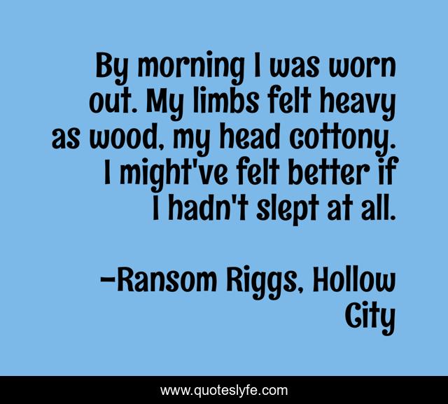 This page presents the quote "By morning I was worn out. My limbs felt heavy as wood, my head cottony. I might've felt better if I hadn't slept at all.". Author of this quote is Ransom Riggs, Hollow City. This quote is about nightmares, overthinking, sleep, tired,.