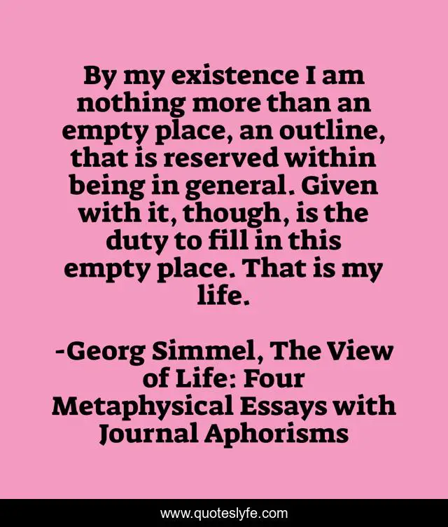 This page presents the quote "By my existence I am nothing more than an empty place, an outline, that is reserved within being in general. Given with it, though, is the duty to fill in this empty place. That is my life.". Author of this quote is Georg Simmel, The View of Life: Four Metaphysical Essays with Journal Aphorisms. This quote is about philosophical, sociology,.