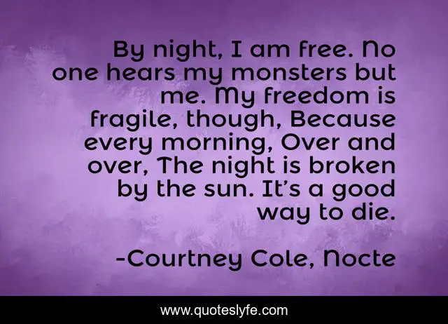 This page presents the quote "By night, I am free. No one hears my monsters but me. My freedom is fragile, though, Because every morning, Over and over, The night is broken by the sun. It’s a good way to die.". Author of this quote is Courtney Cole, Nocte. .