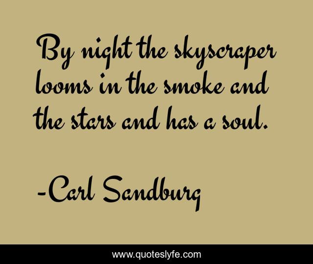 This page presents the quote "By night the skyscraper looms in the smoke and the stars and has a soul.". Author of this quote is Carl Sandburg. .