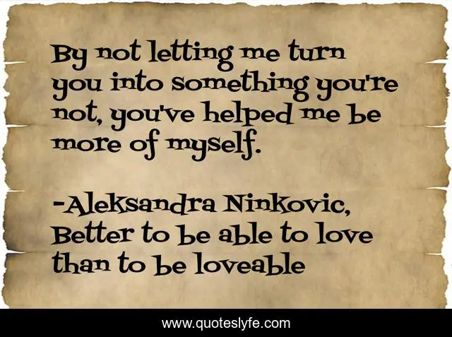 This page presents the quote "By not letting me turn you into something you're not, you've helped me be more of myself.". Author of this quote is Aleksandra Ninkovic, Better to be able to love than to be loveable. This quote is about introspection, introspective, love-and-sayings, relationship, self-actualization,.