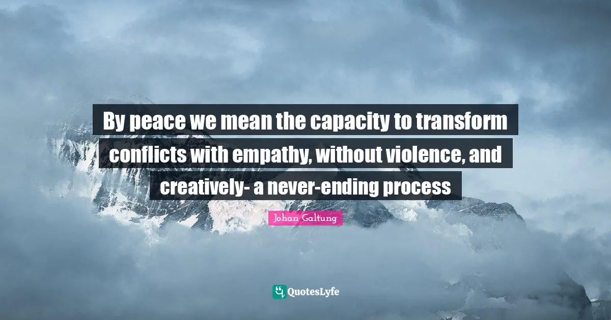 This page presents the quote "By peace we mean the capacity to transform conflicts with empathy, without violence, and creatively- a never-ending process". Author of this quote is Johan Galtung. This quote is about process, empathy, capacity, inspirational, peace, sympathy, mean, violence,.