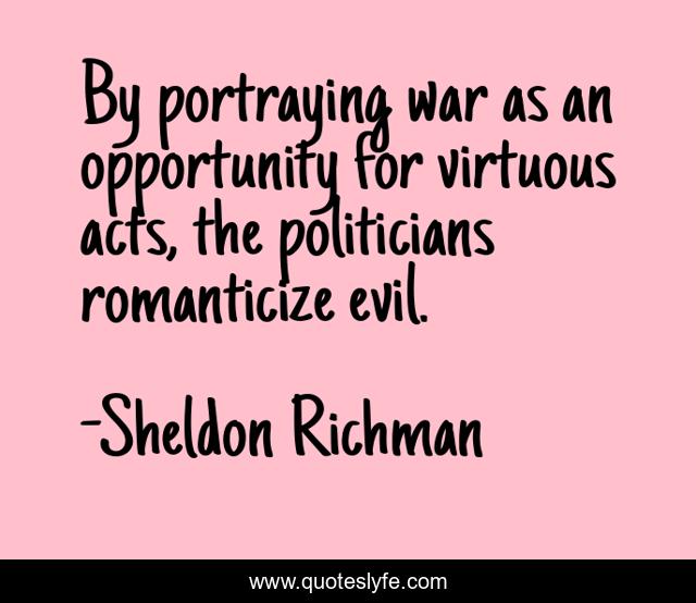This page presents the quote "By portraying war as an opportunity for virtuous acts, the politicians romanticize evil.". Author of this quote is Sheldon Richman. This quote is about anarchy, following-orders, murder, government, freedom, peace, laissez-faire, non-aggression-principle, liberty,.