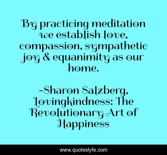 This page presents the quote "By practicing meditation we establish love, compassion, sympathetic joy & equanimity as our home.". Author of this quote is Sharon Salzberg, Lovingkindness: The Revolutionary Art of Happiness. This quote is about love, mindfulness, peace, buddhism, inspirational, enthusiasm, affection,.