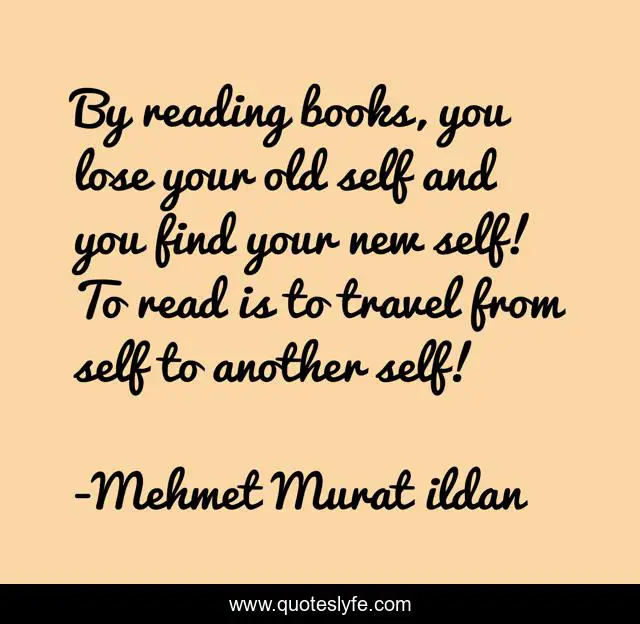 This page presents the quote "By reading books, you lose your old self and you find your new self! To read is to travel from self to another self!". Author of this quote is Mehmet Murat ildan. This quote is about ildan-words, mehmet-murat-ildan, ildan-wise-sayings, turkish, ildan-wisdom, self, turkish-playwrights, turkish-wisdom-words, reading-books,.