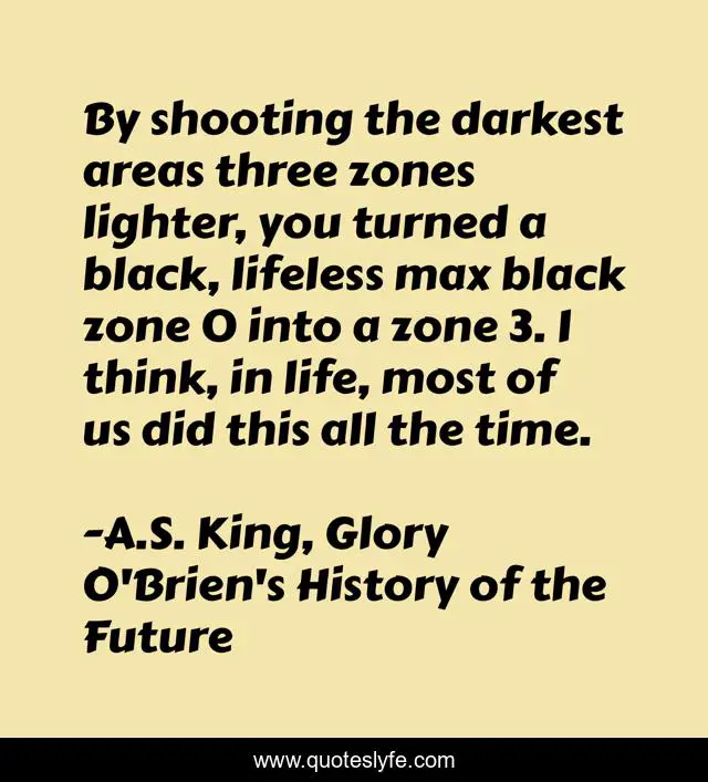 This page presents the quote "By shooting the darkest areas three zones lighter, you turned a black, lifeless max black zone 0 into a zone 3. I think, in life, most of us did this all the time.". Author of this quote is A.S. King, Glory O'Brien's History of the Future. This quote is about photography, glory-obrien, a-s-king,.