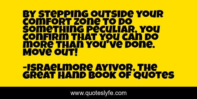 This page presents the quote "By stepping outside your comfort zone to do something peculiar, you confirm that you can do more than you've done. Move out!". Author of this quote is Israelmore Ayivor, The Great Hand Book of Quotes. This quote is about do-more, step-out, stepping, comfort-zone, food-for-thought, zone, confirm, comfort, excel,.