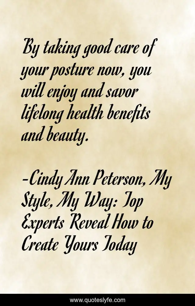 "Cindy Ann Peterson, My Style, My Way: Top Experts Reveal How to Create Yours Today Quotes." Quoteslyfe.com, 2025. Sat. 06 Dec. 2025. <https://www.quoteslyfe.com/quote/By-taking-good-care-of-your-posture-144343>.
